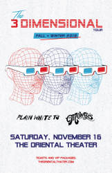 6pm - VIP Meet & Greet7pm - GA Doors8pm - New Politics9pm - Mowglis10pm - Plain White T'sThe Three Dimensional VIP ThrowdownPackage includes:One general admission ticketEarly entry into the venueExclusive meet & greet with select members of Plain White T’s & The Mowgli’sPersonal photograph with select members of Plain White T’s & The Mowgli’sLimited edition Three Dimensional tour kaleidoscopeCollectible Three Dimensional tour poster (limited print)Three Dimensional enamel pin set (ft. all 3 bands)Exclusive Three Dimensional VIP merchandise itemThree Dimensional meet & greet laminateLimited availabilityThe Three Dimensional VIP Tour PackagePackage includes:One general admission ticketEarly entry into the venueLimited edition Three Dimensional tour kaleidoscopeCollectible Three Dimensional tour poster (limited print)Three Dimensional enamel pin set (ft. all 3 bands)Exclusive Three Dimensional VIP merchandise itemThree Dimensional tour laminateLimited availability