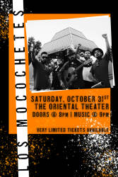 Los Mocochetes are a Xicano/Funk band from Denver, CO that mixes politically urgent messaging with groovalicious rhythms and melodies to create revolutionary music you can dance to. Primarily inspired by their indigenous roots, the Mocos create music from a variety of influences, deftly crossing language barriers and musical genres to spawn a new sound that is also somehow familiar. Much like their Mestizo heritage (Mestizo means mixed Indigenous/european ancestry), these boys are the perfect blend of classical and futuristic, and their live performances will leave you feeling moved in all 4 directions.