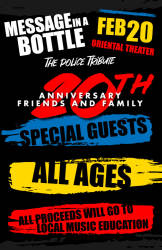 Come family and friends, come celebrate with us 20 years of this influential tribute band in Colorado! The first part of this celebration will be many bands from the Denver music scene performing other hits from The Police. Second part will be Message in a Bottle performing all the greatest hits from The Police!